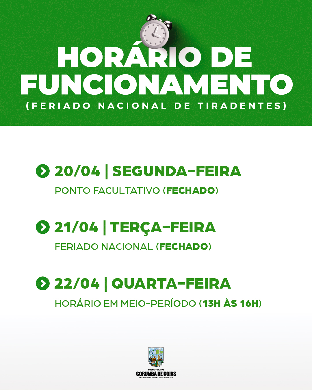 📢 ATENÇÃO: HORÁRIO DE FUNCIONAMENTO – FERIADO DE TIRADENTES