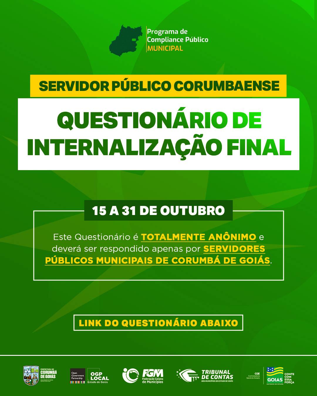 A Prefeitura Municipal de Corumbá de Goiás informa que, entre 15 e 31 de outubro, estará disponível o Questionário de Internalização Final, etapa do Eixo de Ética do Programa de Compliance Público Municipal. A participação é exclusiva para servidores públicos e o questionário é totalmente anônimo, garantindo confidencialidade às respostas.