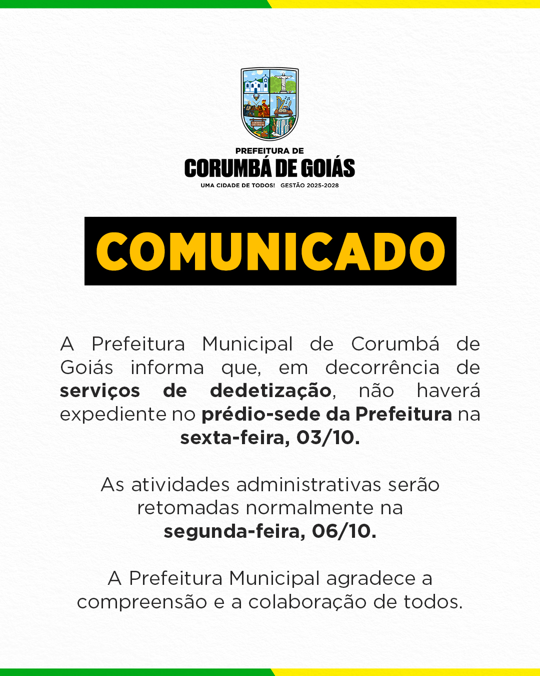 A Prefeitura Municipal de Corumbá de Goiás informa que, em decorrência de serviços de dedetização, não haverá expediente no prédio-sede da Prefeitura na sexta-feira, 03/10.