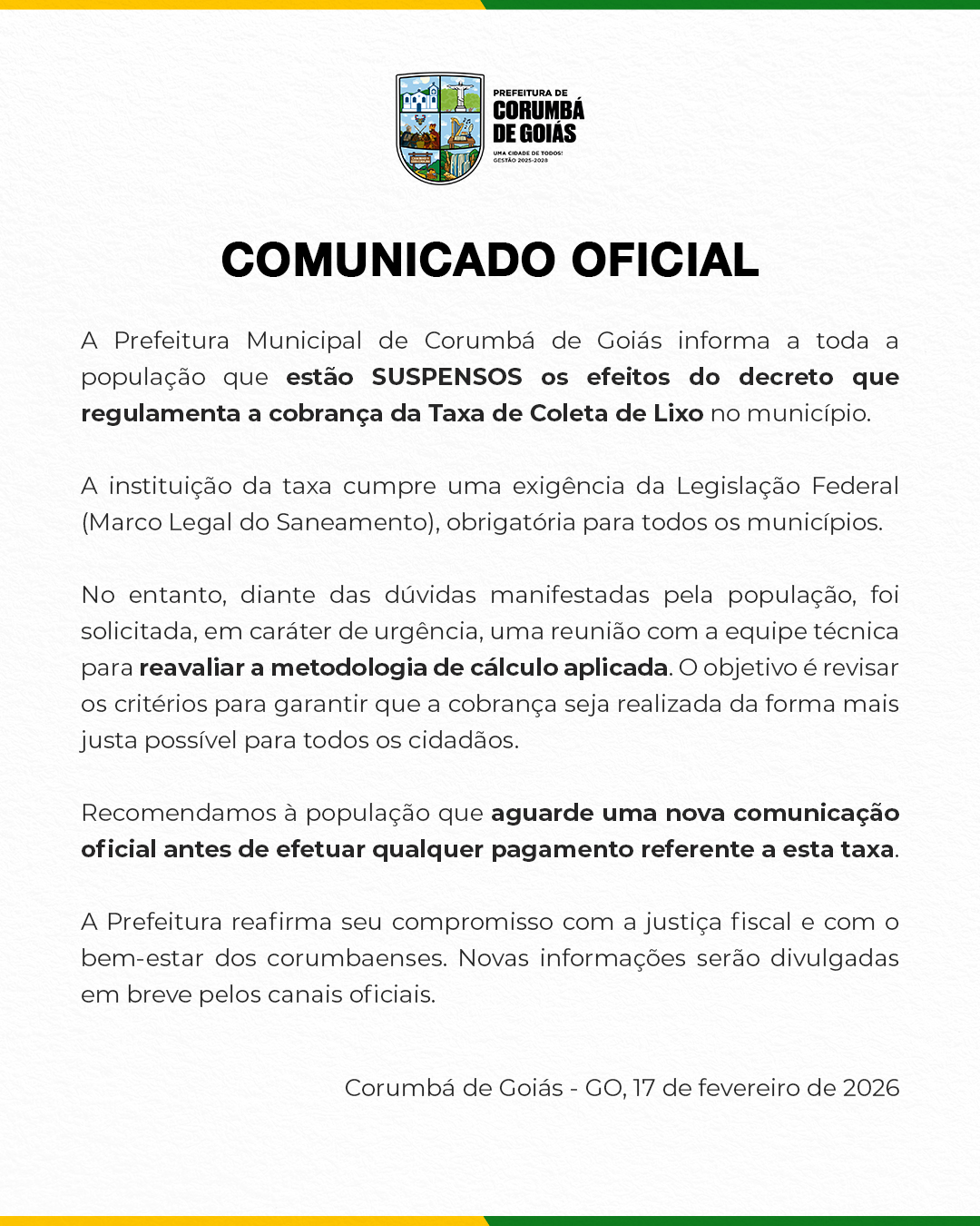 A Prefeitura Municipal de Corumbá de Goiás informa a toda a população que estão SUSPENSOS os efeitos do decreto que regulamenta a cobrança da Taxa de Coleta de Lixo no município.