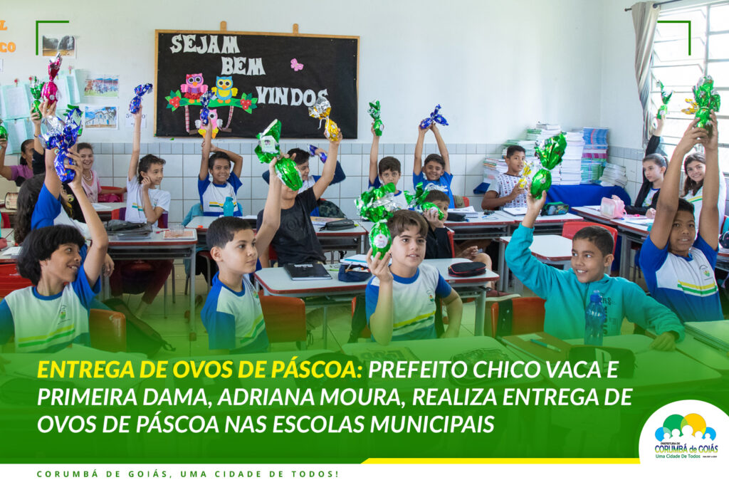 O Prefeito Municipal, Chico Vaca, juntamente com a Primeira Dama, Adriana Moura, entregaram pessoalmente mais de mil ovos de páscoa para os alunos das escolas municipais de Corumbá de Goiás.