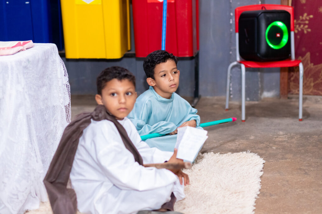A peça teatral envolveu estudantes de diversas faixas etárias, desde o maternal até o 5º ano, demonstrando a integração de toda a unidade escolar.