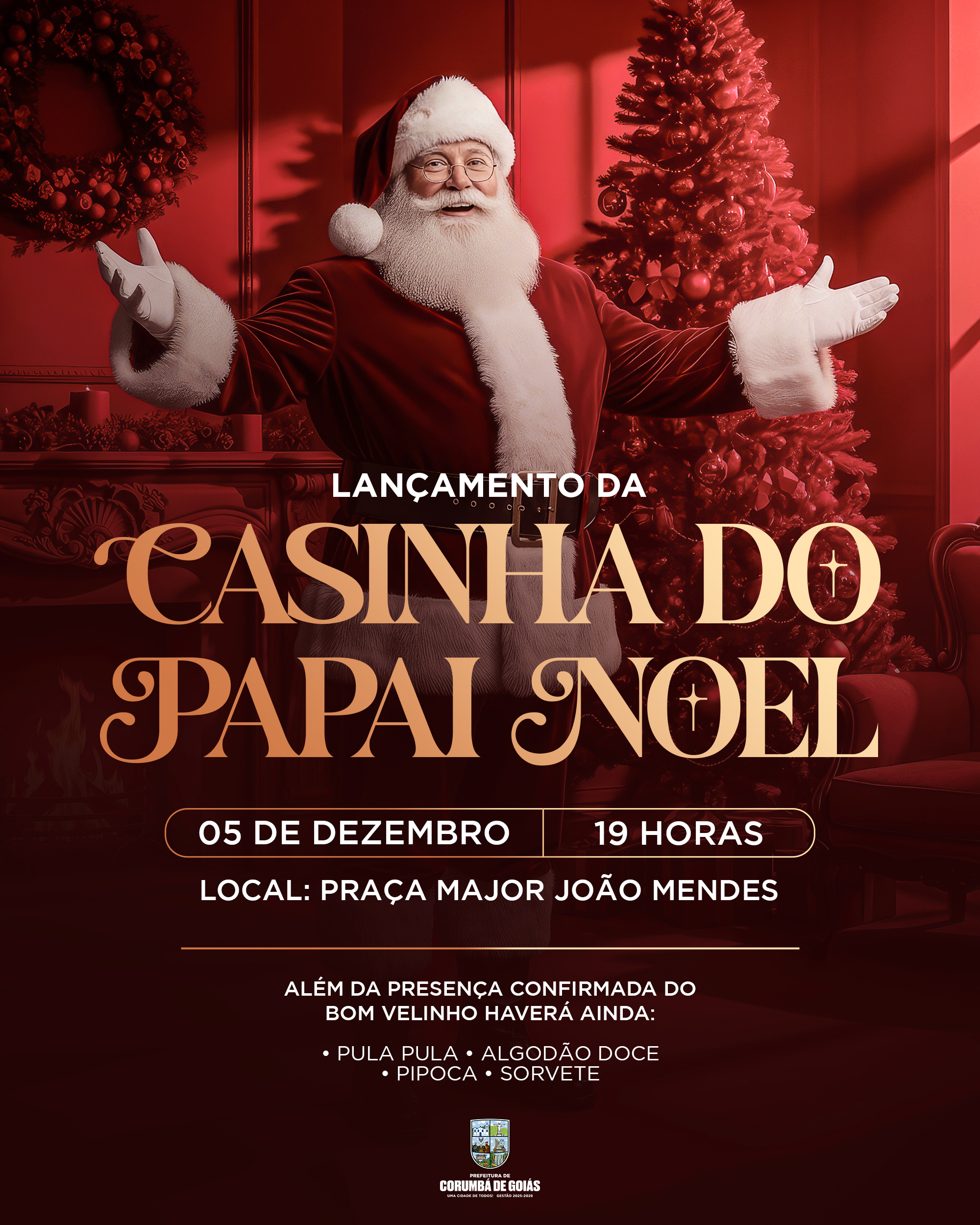 Prepare o coração e traga a família! A Prefeitura preparou uma noite inesquecível para inaugurarmos a nossa Casinha do Papai Noel. Vai ser um momento de muita luz, alegria e confraternização.