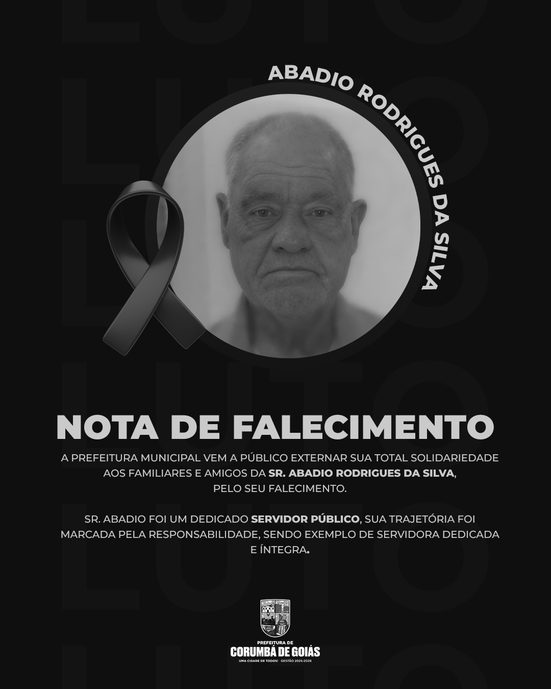 Lamentamos profundamente o falecimento do senhor Abadio Rodrigues da Silva, grande contribuinte de nossa cidade e parceiro da Prefeitura de Corumbá de Goiás.