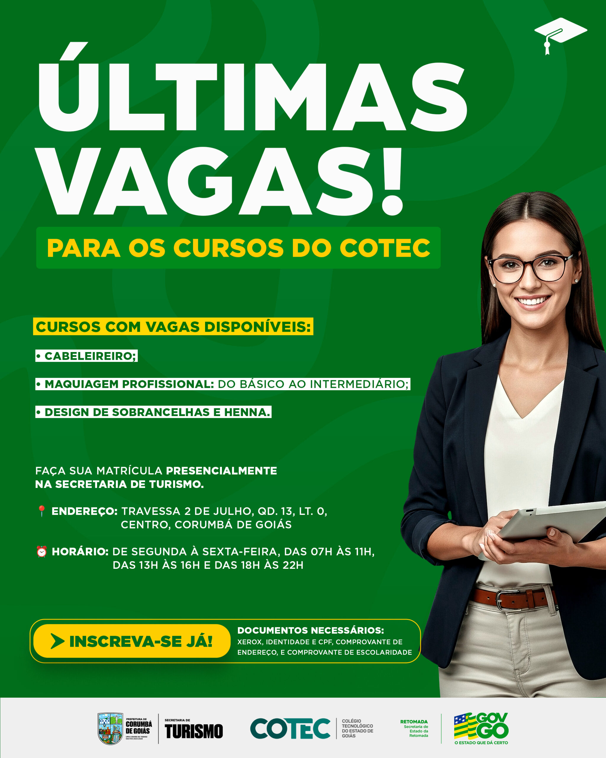 A Prefeitura Municipal informa que estão se esgotando às vagas para as turmas de qualificação profissional, realizadas em parceria com o COTEC (Colégio Tecnológico do Estado de Goiás).