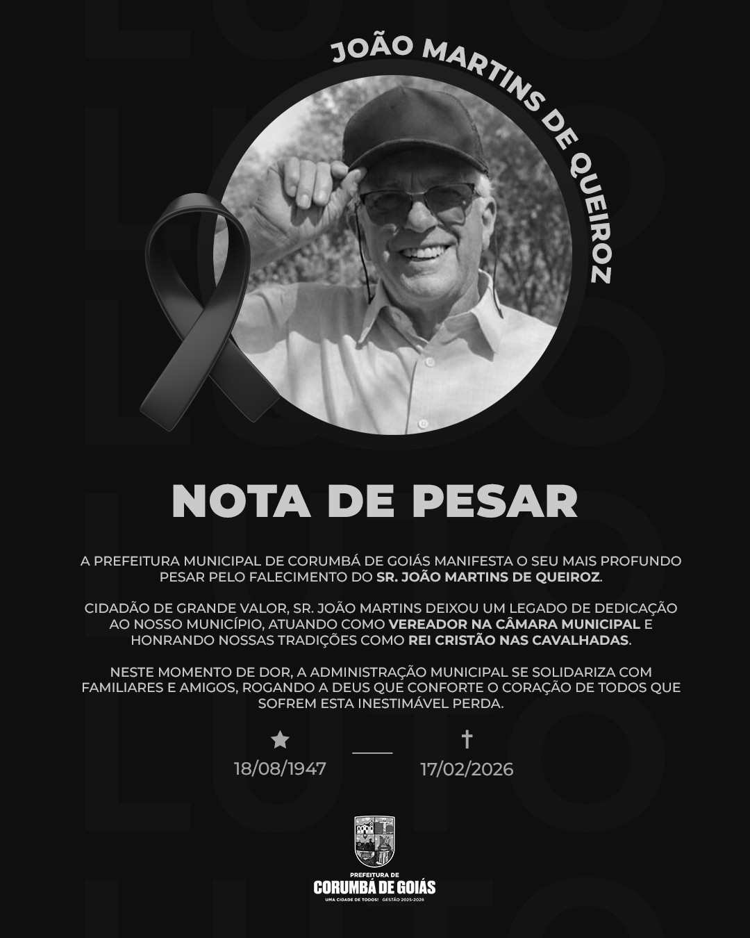 A Prefeitura Municipal de Corumbá de Goiás manifesta o seu mais profundo pesar pelo falecimento do Sr. João Martins de Queiroz.