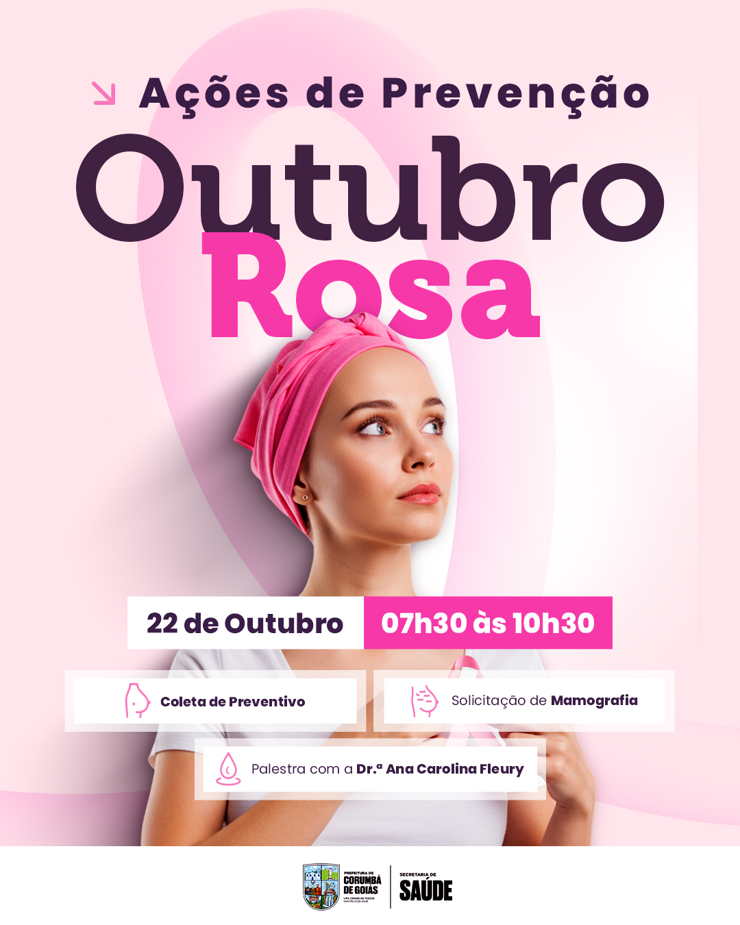 No dia 22 de outubro, das 7h30 às 10h30, haverá coleta de preventivo, solicitação de mamografia, palestra com a Dra. Ana Carolina Fleury e, para completar a manhã, um delicioso lanche.