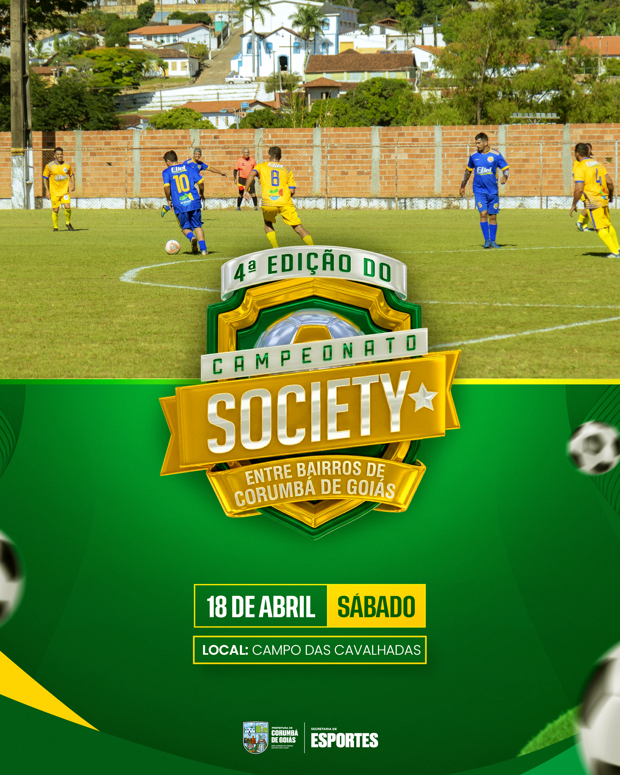 A paixão pelo futebol vai tomar conta da nossa cidade mais uma vez! A Prefeitura Municipal, por meio da Secretaria de Esportes, tem a alegria de anunciar a realização da 4ª Edição do Campeonato Society entre Bairros de Corumbá de Goiás.