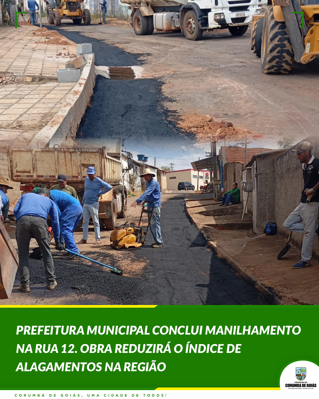 A Prefeitura de Corumbá de Goiás, por meio da Secretaria Municipal de Infraestrutura e Obras, concluiu o manilhamento no encontro da rua 12 com a avenida Francisco Bruno, próximo ao Supermercado América.