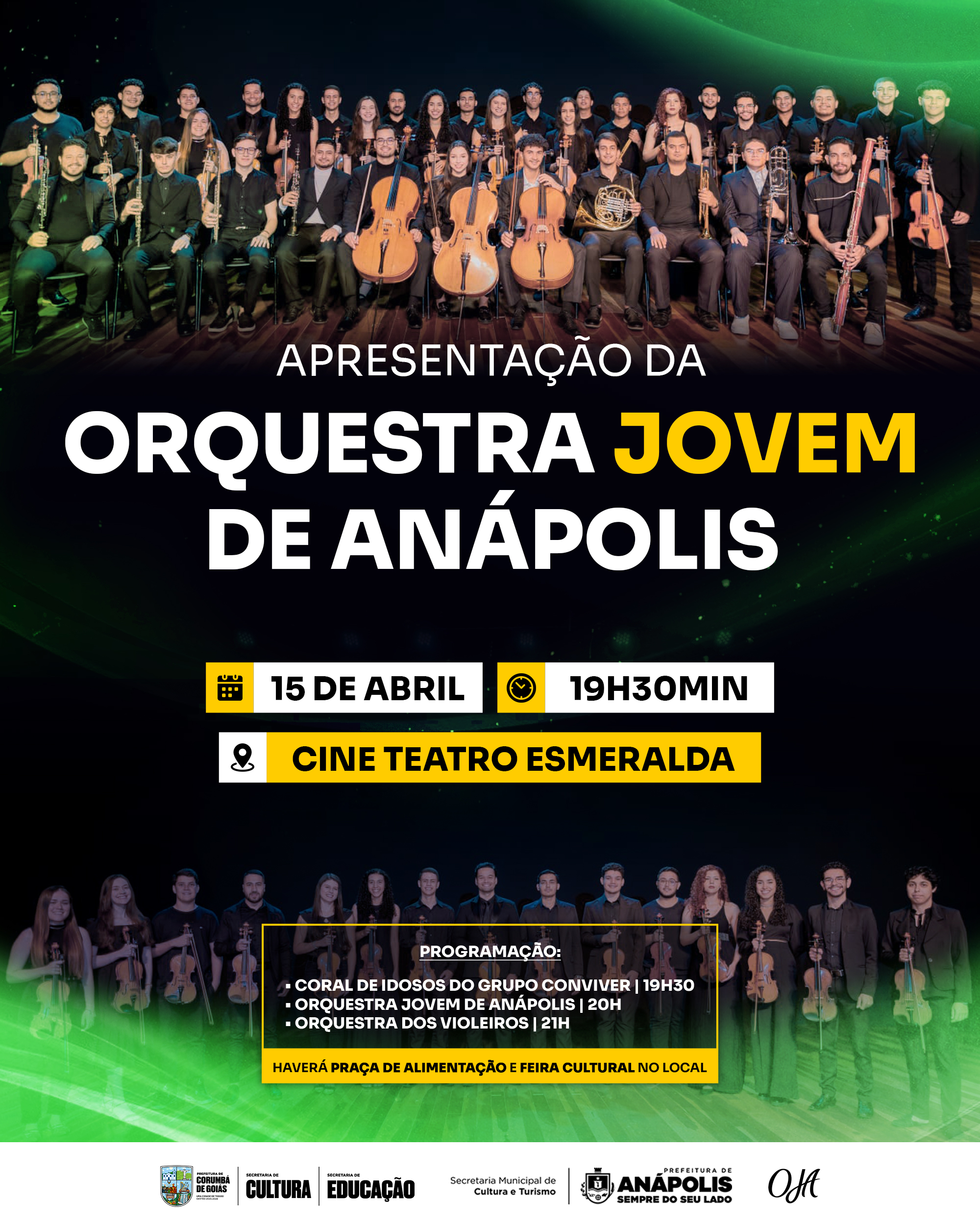 No dia 15 de abril, a Prefeitura Municipal tem a honra de promover uma noite de espetáculos inesquecíveis no histórico Cine Teatro Esmeralda. O grande destaque do evento será a apresentação da Orquestra Jovem de Anápolis.