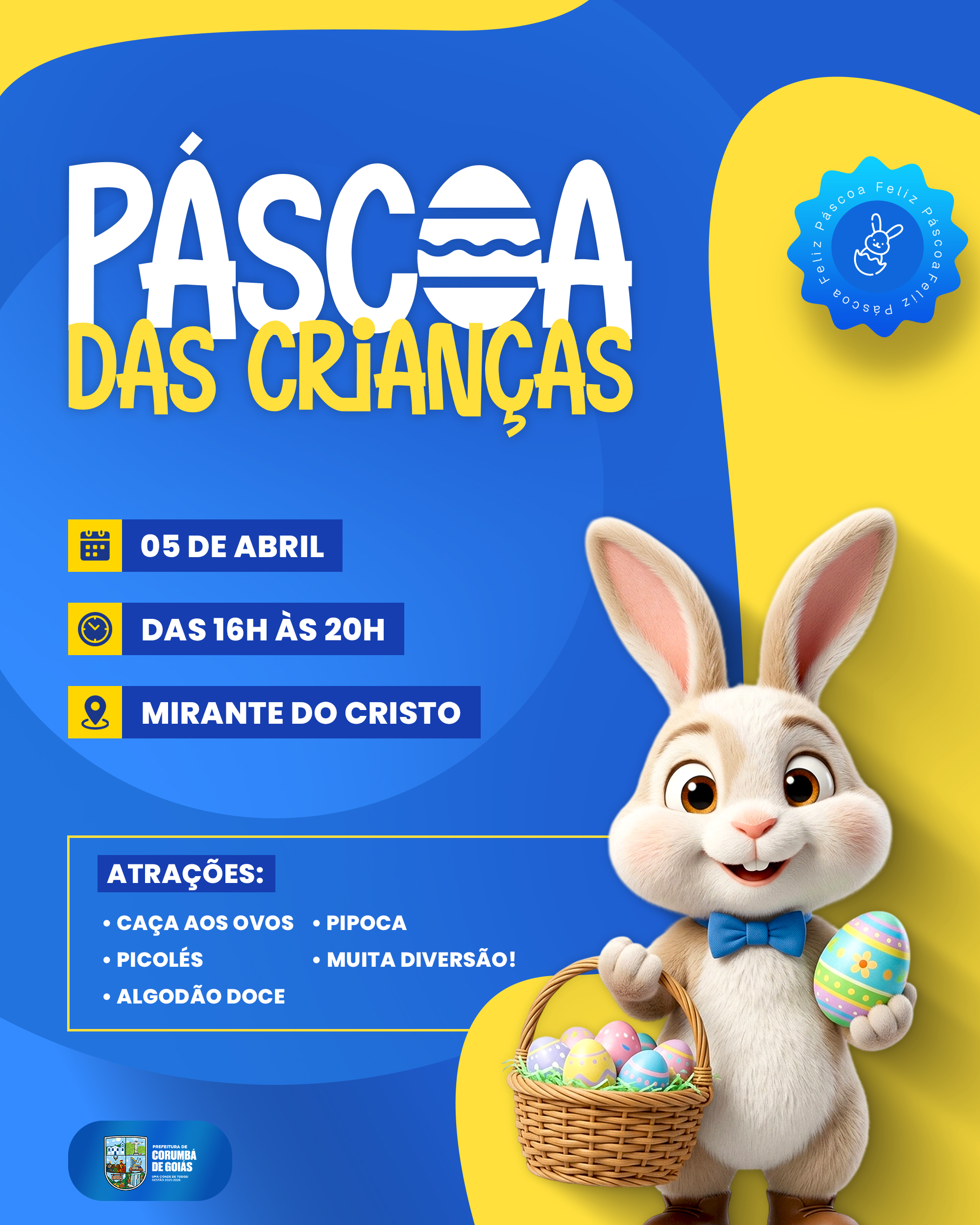 A magia da Páscoa vai tomar conta da nossa cidade! A Prefeitura Municipal, por meio de uma ação conjunta entre a Secretaria de Turismo e a Secretaria de Cidadania e Justiça Social, tem a alegria de convidar todas as famílias para a Páscoa das Crianças.