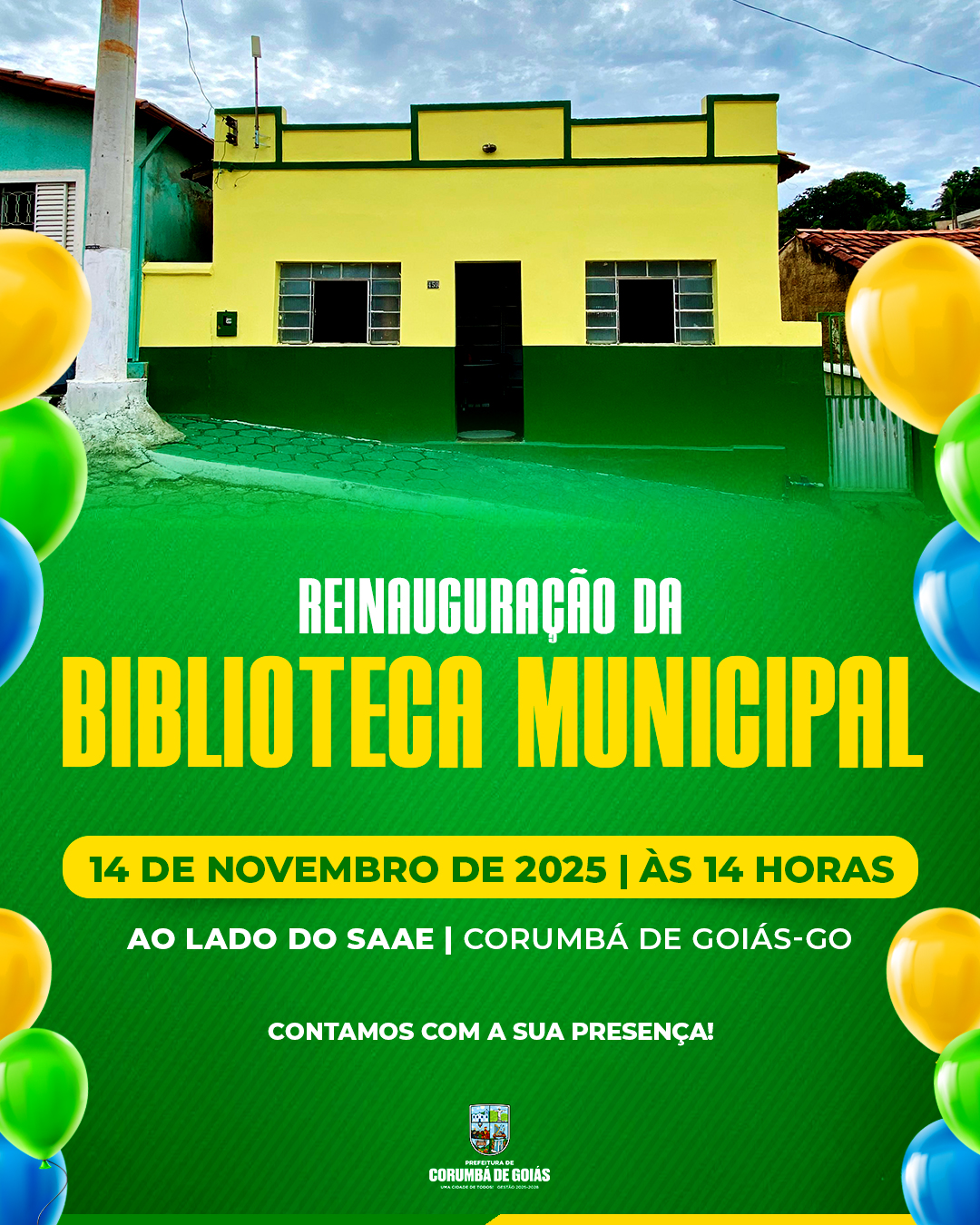 A Prefeitura Municipal de Corumbá de Goiás convida toda a comunidade para participar da reinauguração da Biblioteca Municipal, que será realizada no dia 14 de novembro de 2025, às 14 horas.