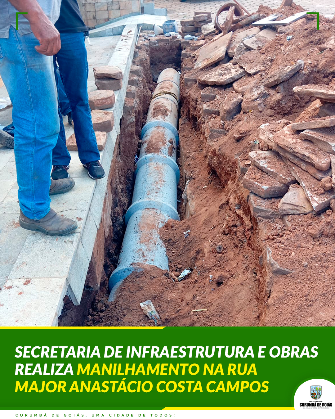 A Prefeitura Municipal, por meio da Secretaria de Infraestrutura e Obras, concluiu, na última sexta-feira, o manilhamento da Rua Major Anastácio Costa Campos, substituindo a antiga galeria de pedra por um sistema de manilhas, garantindo mais eficiência no escoamento das águas pluviais e mais segurança para os moradores.